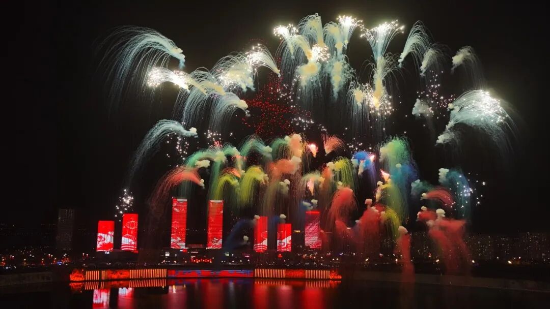 随后,伴着一声清脆的礼炮声响,焰火表演正式拉开帷幕。一道道流光划破长空,瞬间绽放成五彩斑斓的礼花,如牡丹盛开、如银菊怒放,将乌兰木伦湖映照得绚丽多彩。高空焰火如瀑布倾泻而下,低空烟花如繁星洒落湖面,市民游客纷纷仰首凝望,脸上洋溢着幸福的笑容。璀璨的烟花,将节日的圆满与温情,定格在每个人的记忆深处。