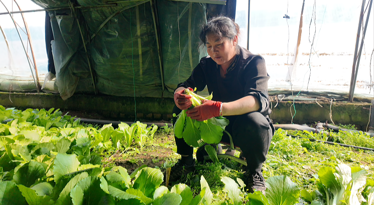 在鄂托克旗乌兰镇嘉怡农牧种植大棚里,种植户杭金梅蹲在菜畦边,一手拢住小白菜碧绿的叶片,一手利落地贴根割下。身后一筐筐鲜菜堆得冒了尖,第二天一早,这些小白菜就会出现在集市上。
