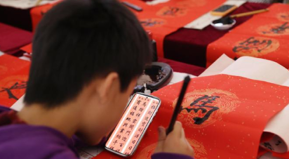 宁夏银川:孩童挥毫迎马年