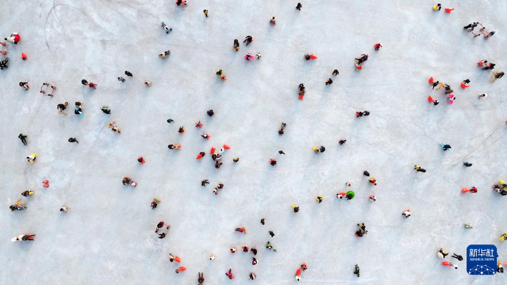 1月17日,市民在银川文旅集团览山公园落日冰场玩耍(无人机照片)。