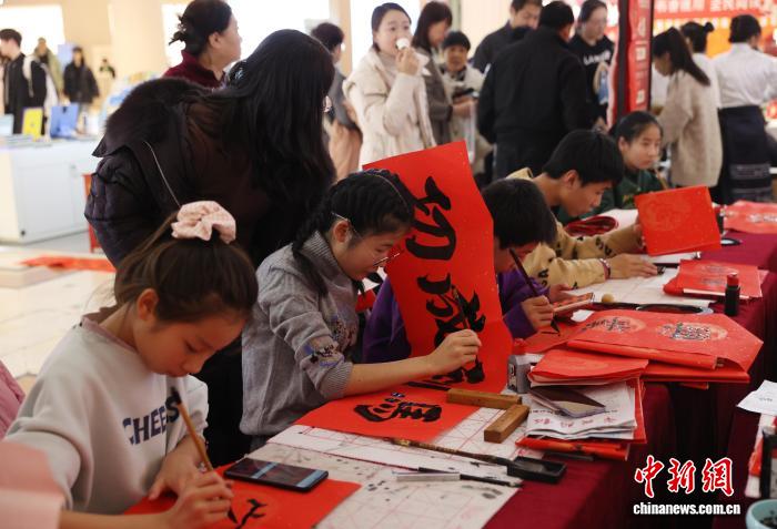 2月8日,“龙马精神迎新春邻里团圆乐万家”宁夏新时代文明实践集中示范暨金凤区非遗过大年活动在银川市金凤区启幕。活动现场,孩子们纷纷提笔蘸墨,书写祝福,在浓浓的年味中迎接马年的到来。图为小朋友写春联。中新社记者于晶 摄