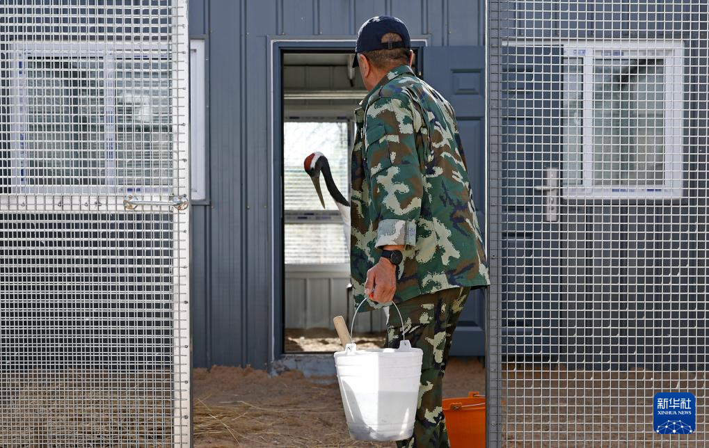 4月9日,在宁夏青铜峡库区湿地自然保护区丹顶鹤标准化适应性训练场,工作人员为丹顶鹤准备食物。