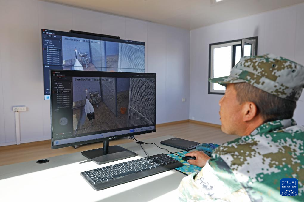 4月9日,在宁夏青铜峡库区湿地自然保护区丹顶鹤标准化适应性训练场,工作人员通过监控查看丹顶鹤的进食状况。