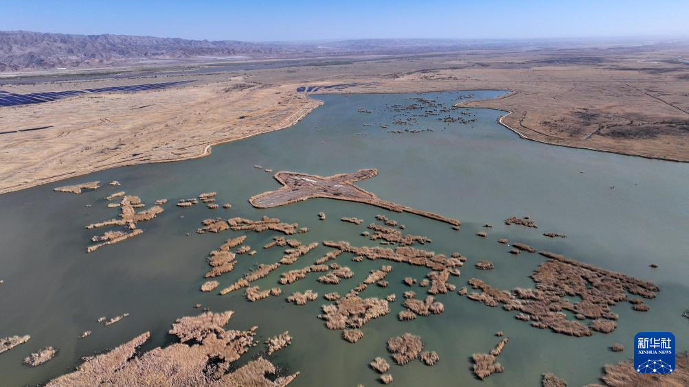 这是4月9日拍摄的宁夏青铜峡库区湿地自然保护区,丹顶鹤在适应性训练后将在这里野化放归(无人机照片)。