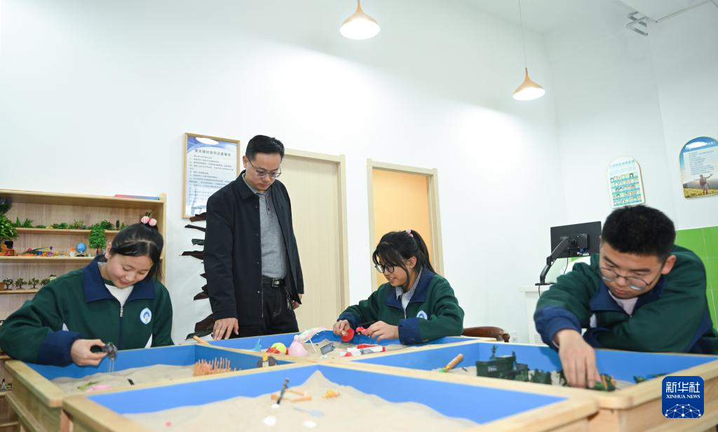 12月24日,在青海省海北藏族自治州门源县浩门镇高级中学,山东援青教师李学鹏(左二)在心理教室指导学生。