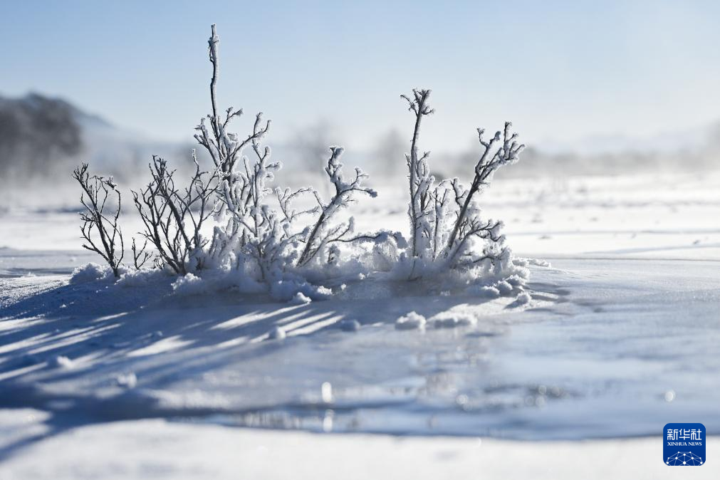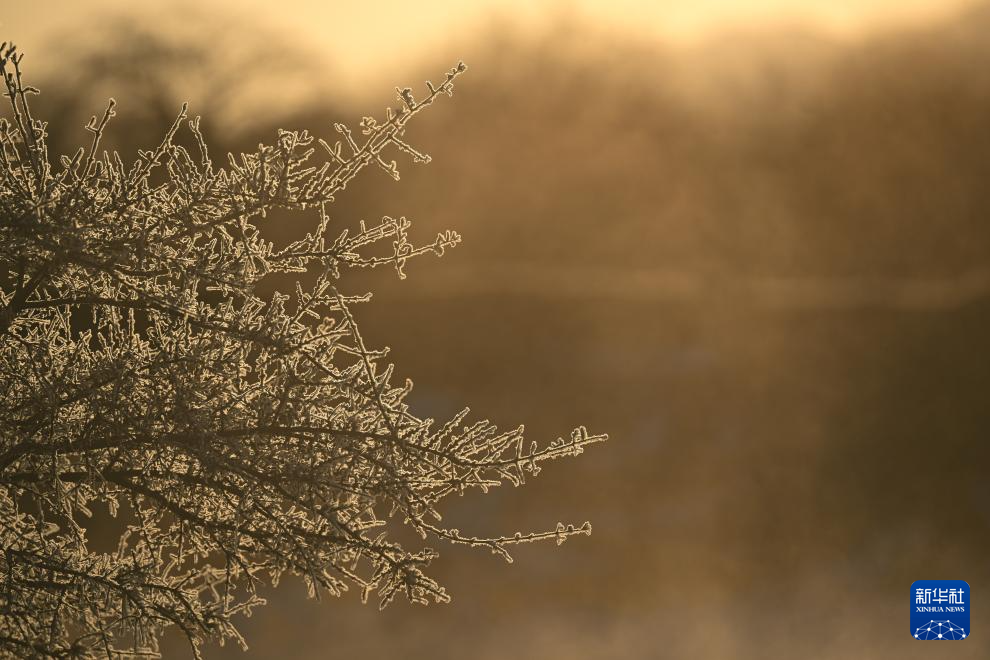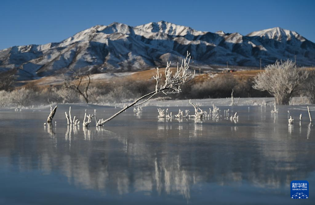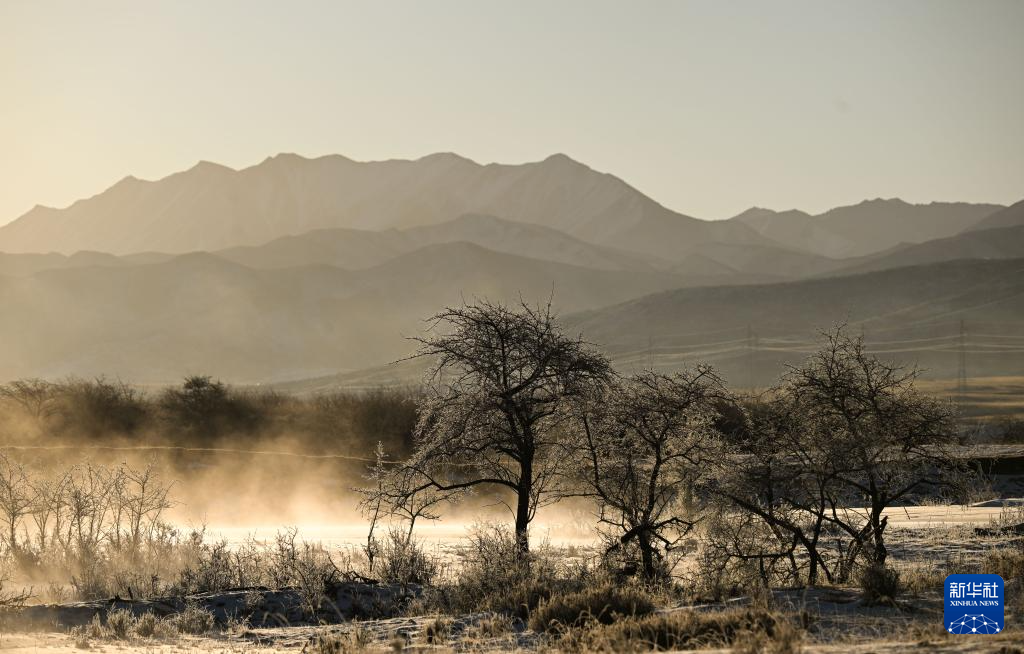 冬日时节,青海省海北藏族自治州祁连县出现雾凇景观,与祁连山的日出相映成趣,美如画卷。