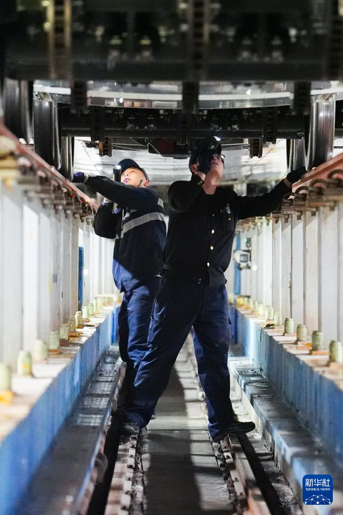 1月27日,中国铁路青藏集团有限公司西宁车辆段动车运用车间工作人员李金石(左)、杨勤雪在检查转向架。