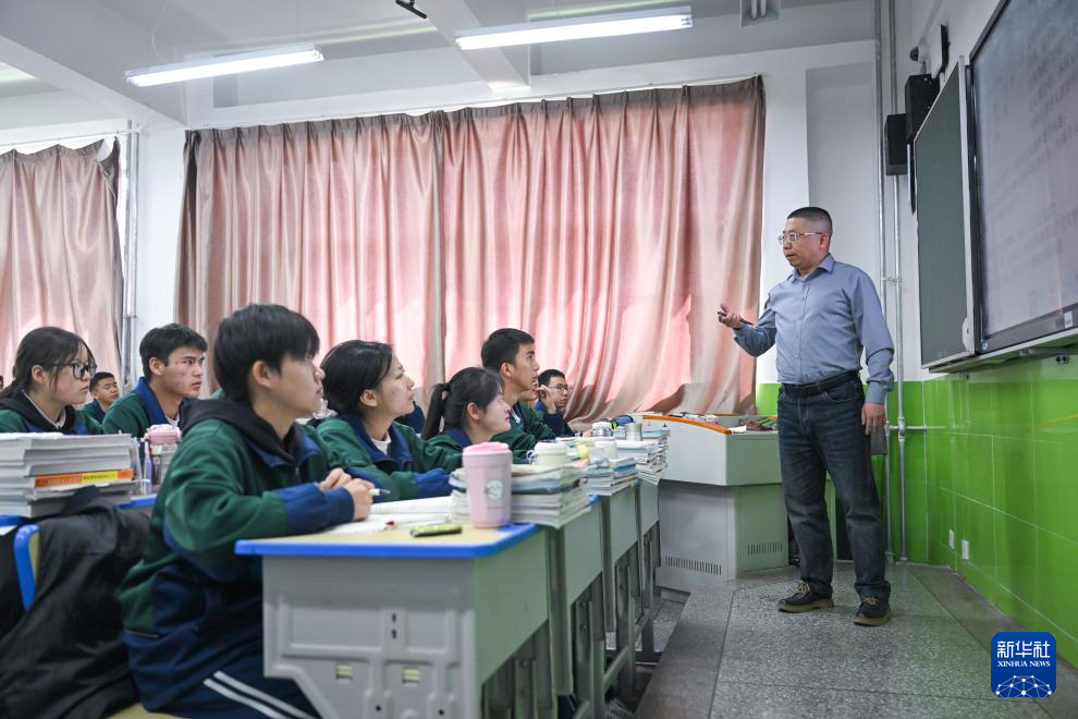 3月31日,在青海省海北藏族自治州门源回族自治县浩门镇高级中学,山东援青教师王程在上课。