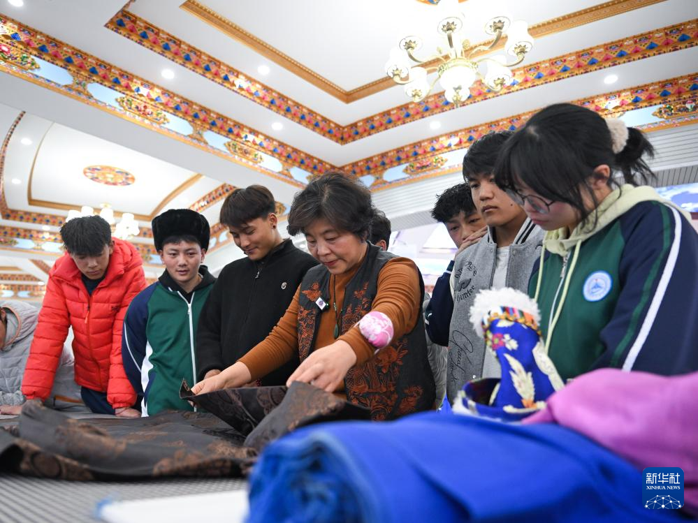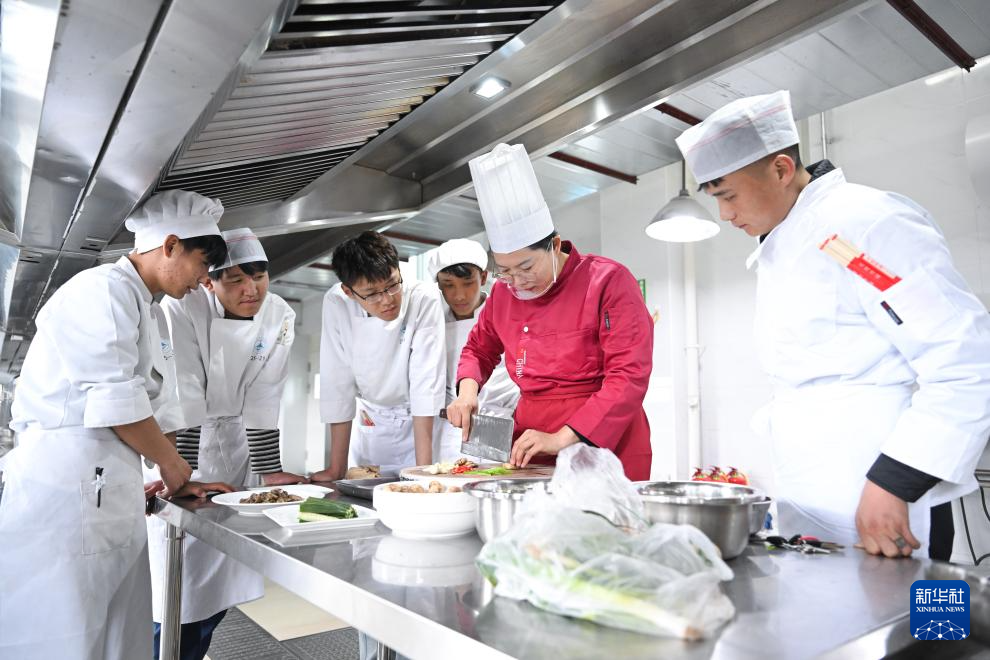 3月30日,在青海省海北藏族自治州职业技术学校,山东援青教师丁连翠(右二)在指导学生实操。