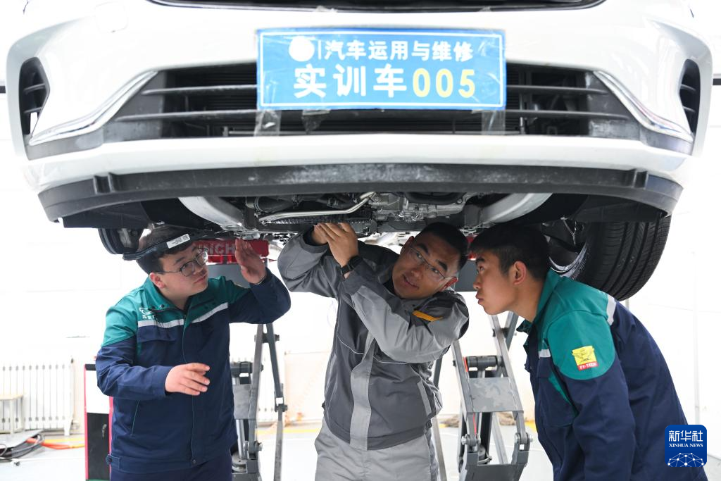 3月30日,在青海省海北藏族自治州职业技术学校,山东援青教师曹强(中)在指导学生实操。