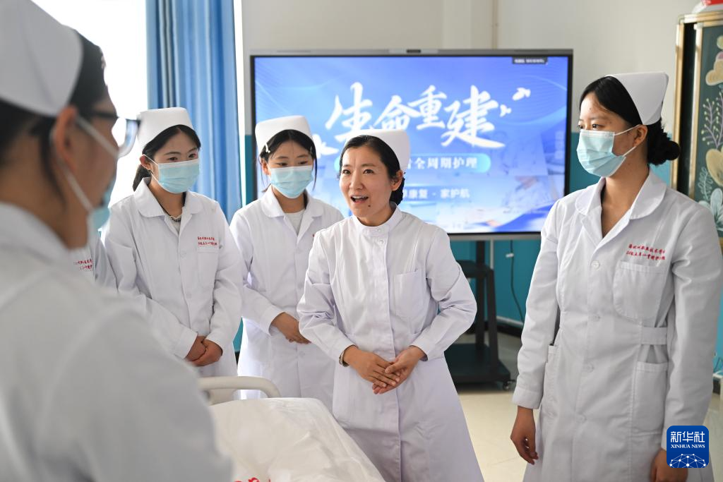 3月30日,在青海省海北藏族自治州职业技术学校,山东援青教师刘芹英(右二)在指导护理专业学生。