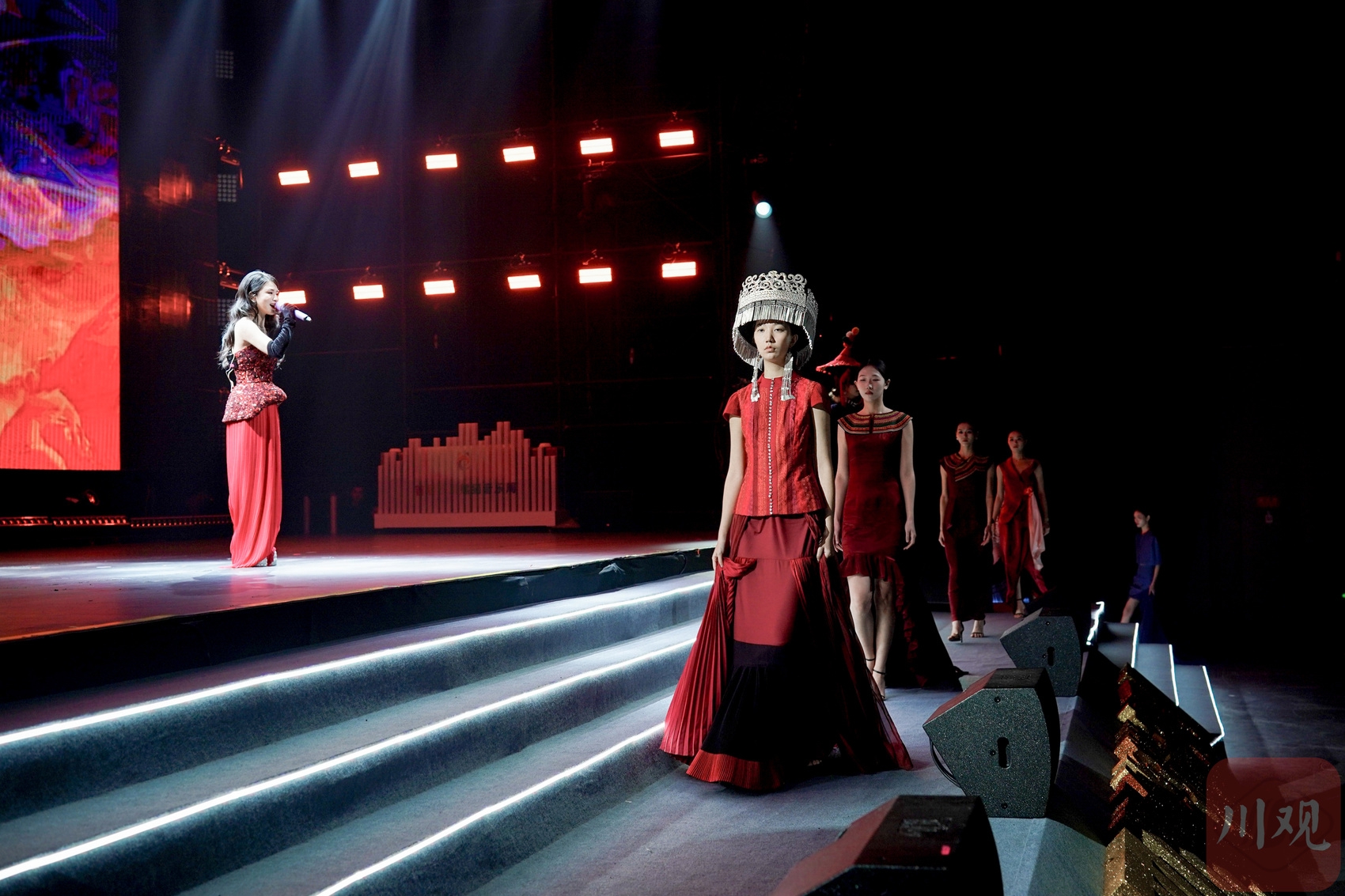 整场的高潮莫过于压轴登场的“交响乐&民族服饰”跨界大秀。在交响乐团恢弘的现场演奏中,模特身着融汇蜀锦、羌绣等非遗元素的现代服饰翩然登场。尤为引人注目的是,川籍歌手黄英惊艳亮相,以她清澈嘹亮的嗓音,唱响了四川经典民歌《太阳出来喜洋洋》。高亢的民歌与磅礴的交响乐奇妙融合,传统时尚视觉与本土经典听觉激情碰撞,将“锦绣天府·安逸四川”的主题演绎得淋漓尽致,台下观众纷纷举起手机,记录这一精彩瞬间。