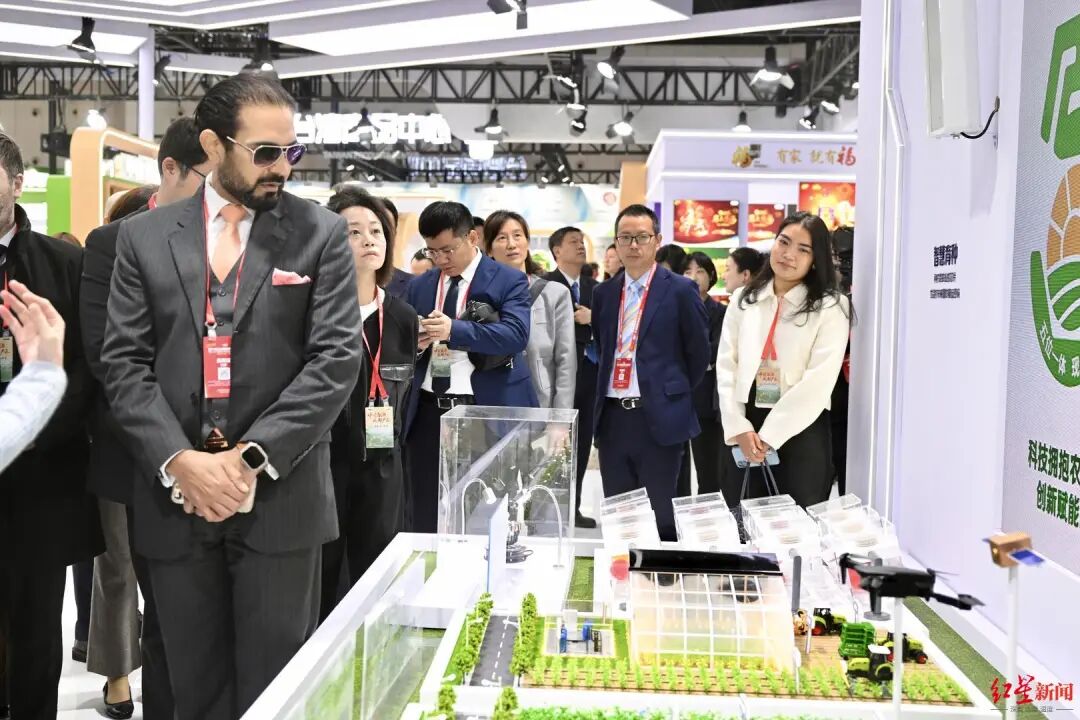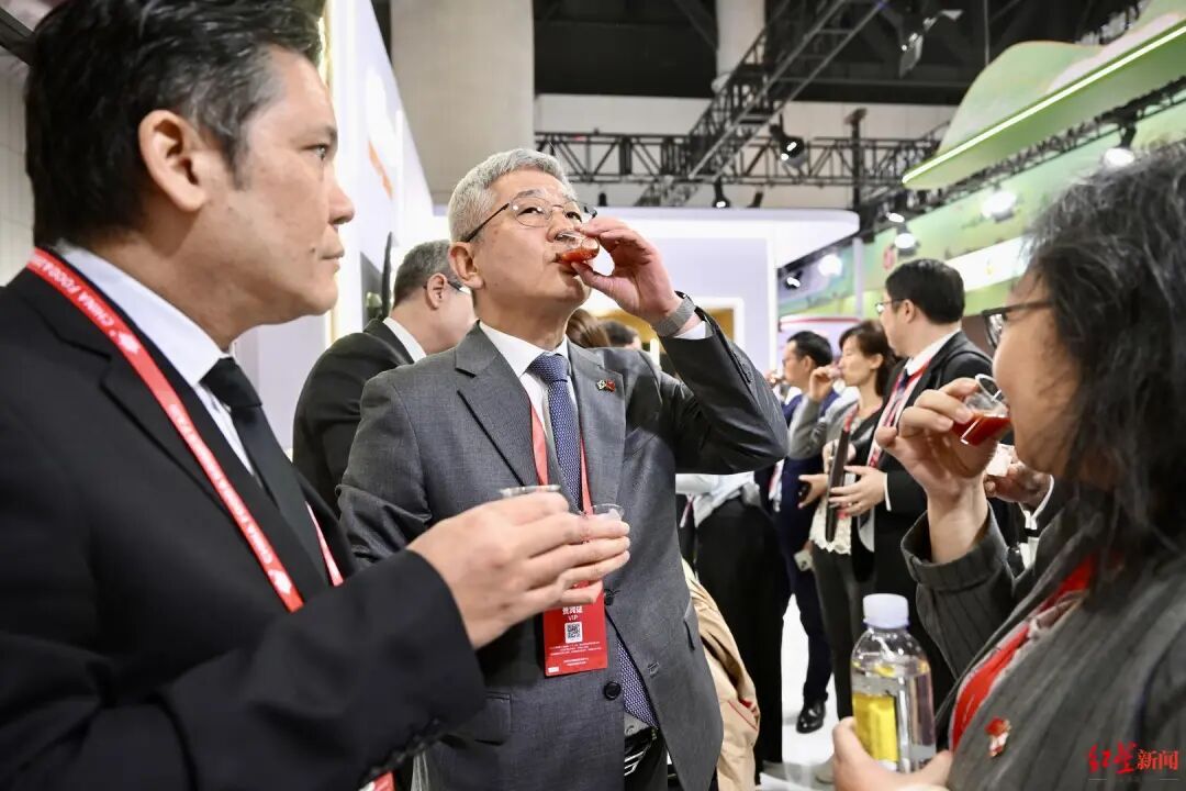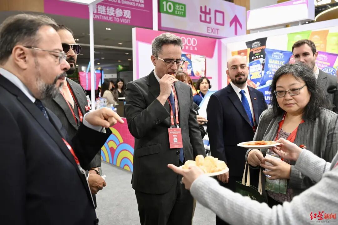 在展馆内,领团成员频频驻足,品尝薯片、美酒等,也对各国特色产品表现出浓厚的兴趣。在加拿大国家馆等国际展区,琳琅满目的进口食品吸引了不少关注。