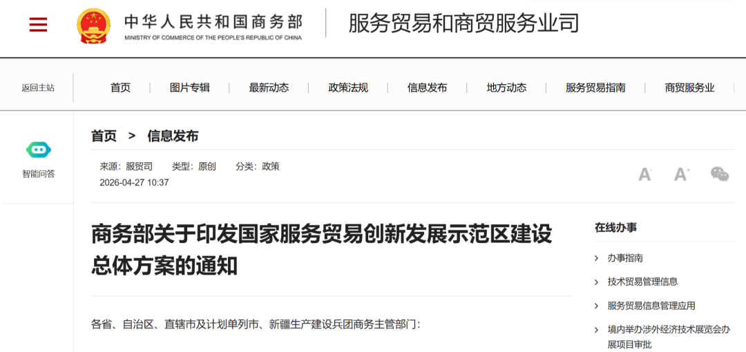 《国家服务贸易创新发展示范区建设总体方案》