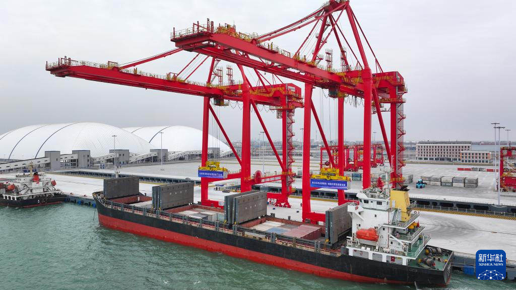 12月22日,装载集装箱的“万木春32”货轮在东营港集装箱码头停靠接卸(无人机照片)。