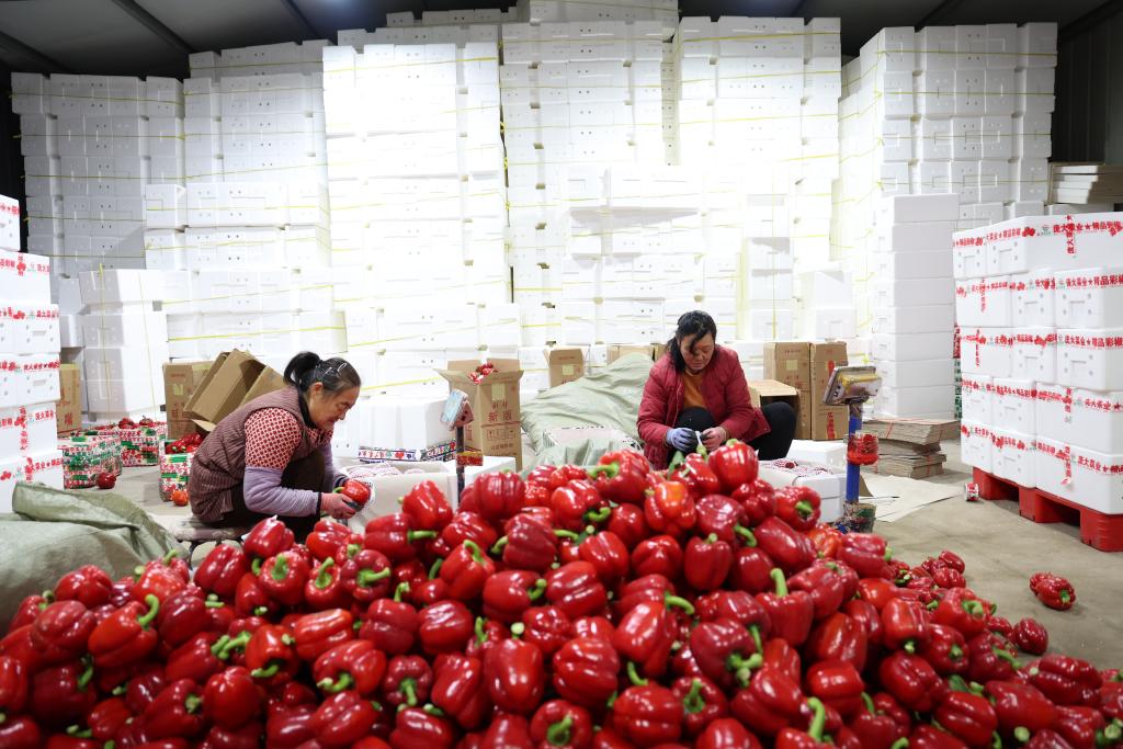 山东寿光市东华蔬菜专业合作社工作人员在对彩椒进行包装、装箱。(受访者供图)