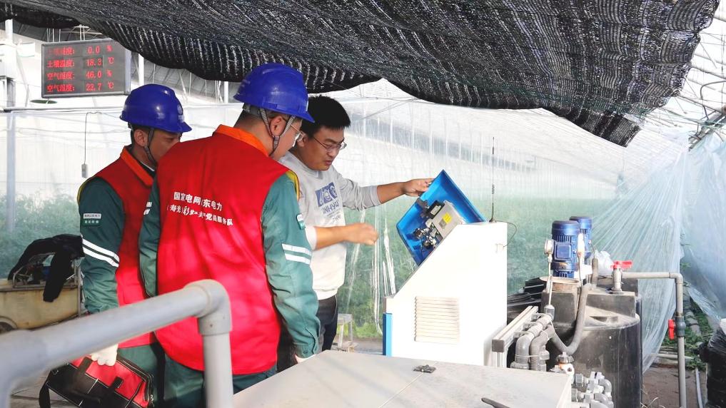 国家电网山东电力(寿光)彩虹共产党员服务队队员到蔬菜大棚为菜农排查用电隐患。(受访者供图)
