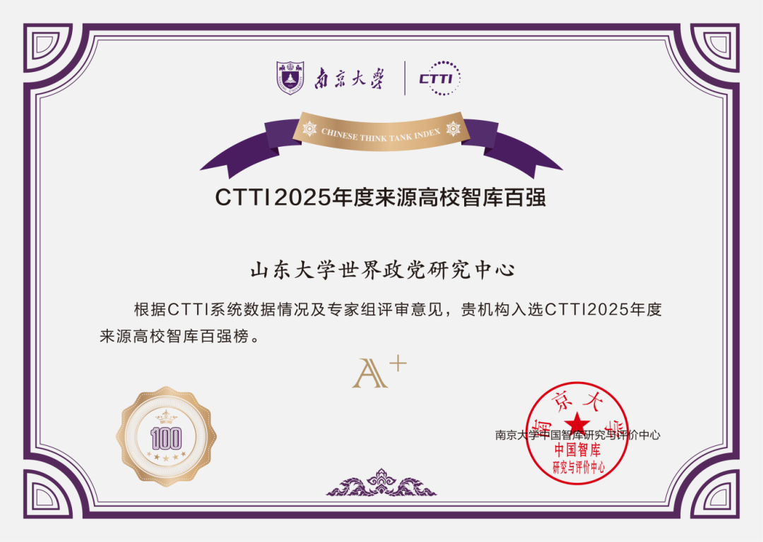 世界政党研究中心成功入选CTTI(中国智库索引)2025年度高校智库百强榜A+等级