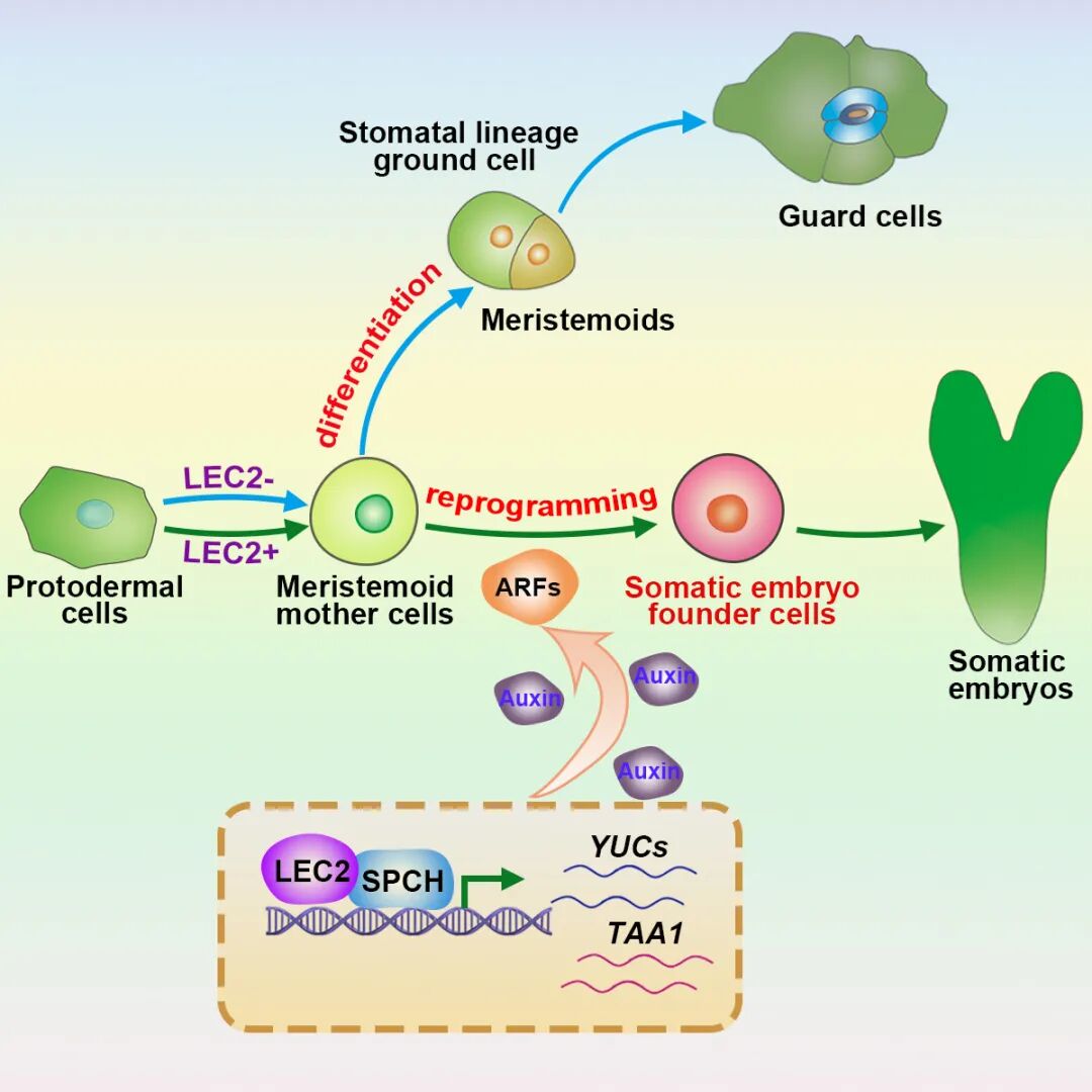 气孔谱系拟分生组织母细胞的两条发育路径生长素的积累对于体细胞向全能干细胞的转变至关重要