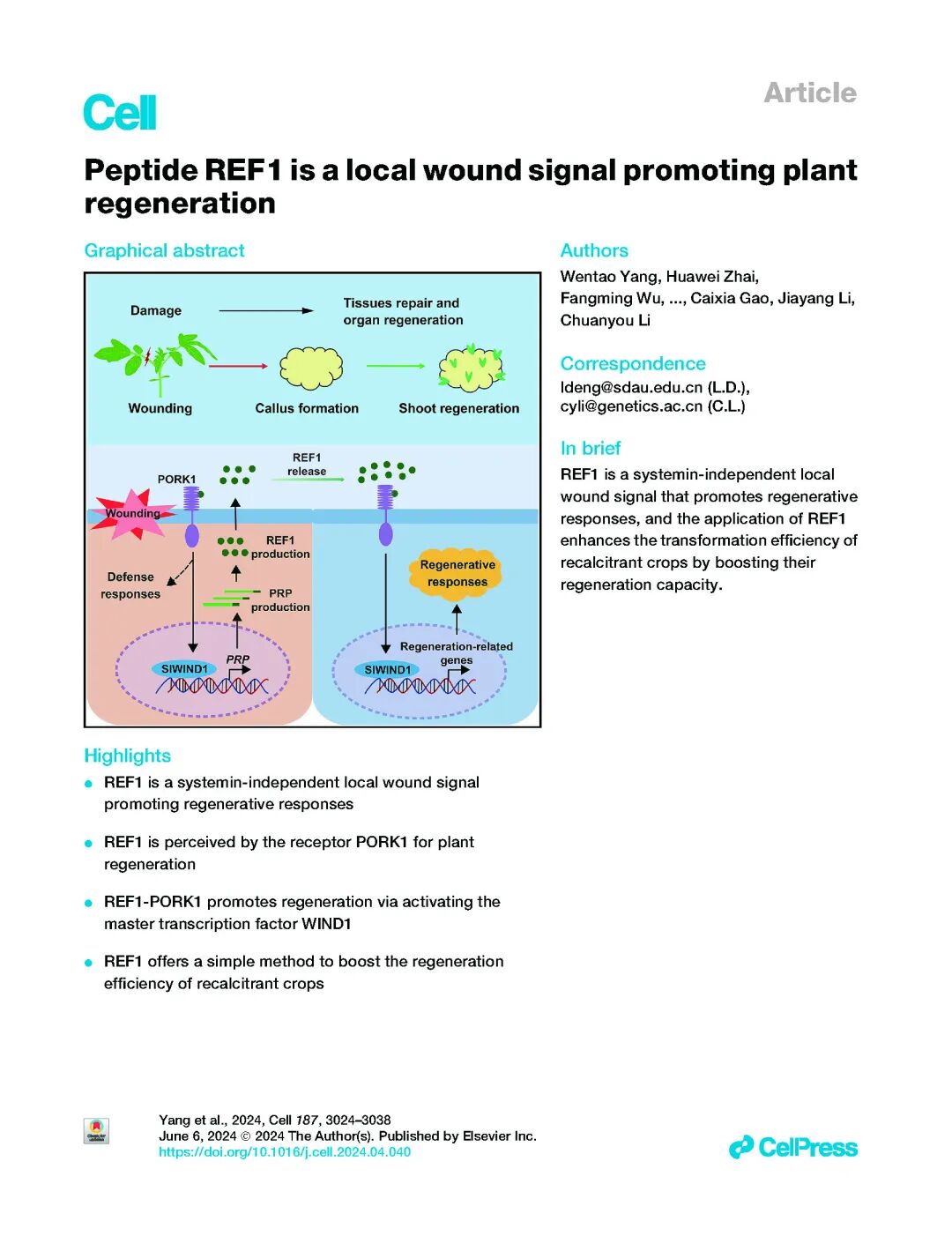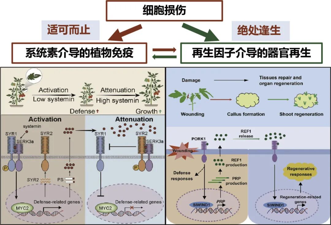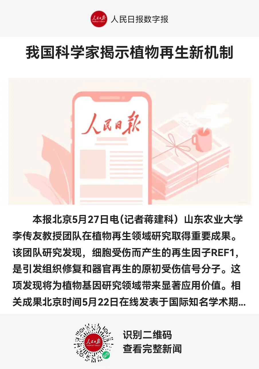 “是什么控制着器官再生”是《科学》杂志在2005年创刊125周年之际提出的125个人类未知的重大科学问题中最重要的25个科学问题之一。该成果以番茄为模式植物,深度解析由系统素和茉莉酸共同调控的植物系统性防御信号通路,成功发现细胞受伤而产生的再生因子REF1是引发组织修复和器官再生的原初受伤信号分子,揭示了其通过激活干细胞调控再生的机理,探明了利用REF1打破物种和基因型限制,大幅提高作物遗传转化效率的便捷技术路径,不仅回答了“是什么控制器官再生”的世纪之问,而且为破解现代生物育种瓶颈问题开辟了新路径。