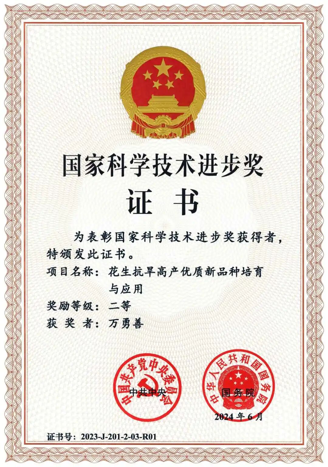 花生是我国重要的油料与经济作物,主要种植在丘陵山地和平原沙质瘠薄地,常因干旱胁迫减产20%-50%,生产上亟需抗旱高产品种。该成果针对我国花生种业“卡脖子”难题,历经20余年,创新协同提高花生抗旱性和产量的育种理论与技术,育成6个抗旱性突出的高产新品种。其中,山花9号和山花7号入选国家骨干型品种、农业农村部主导品种。山花9号推广面积连续9年居全国第一位。6个新品种累计推广7820万亩,年种植面积在全国花生面积占比高达15%,山东省占比高达55%。累计增产26亿公斤,为提升我国油料产能和保障粮油安全做出重要贡献。