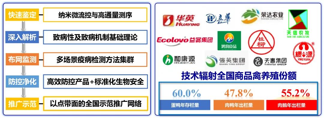 我国水禽产业规模居世界首位,是乡村振兴的重要支柱产业。该成果针对新发疫病制约产业发展的瓶颈问题,创新了水禽新发病毒病纳米微流控芯片浓缩病毒的快速鉴定技术体系;创立了家禽新发病毒病快速鉴定技术平台;构建了新发家禽病毒病高效检测技术体系。研创了防控新发家禽病毒病的系列生物制品;创建了种鸭垂直传播病毒病高效净化技术体系。产出了包括国家一类新兽药、国家标准、美国专利及高水平研究论文等系列标志性成果技术成果覆盖全国水禽养殖量的70%以上,有效保障了我国水禽养殖业的绿色、健康发展。