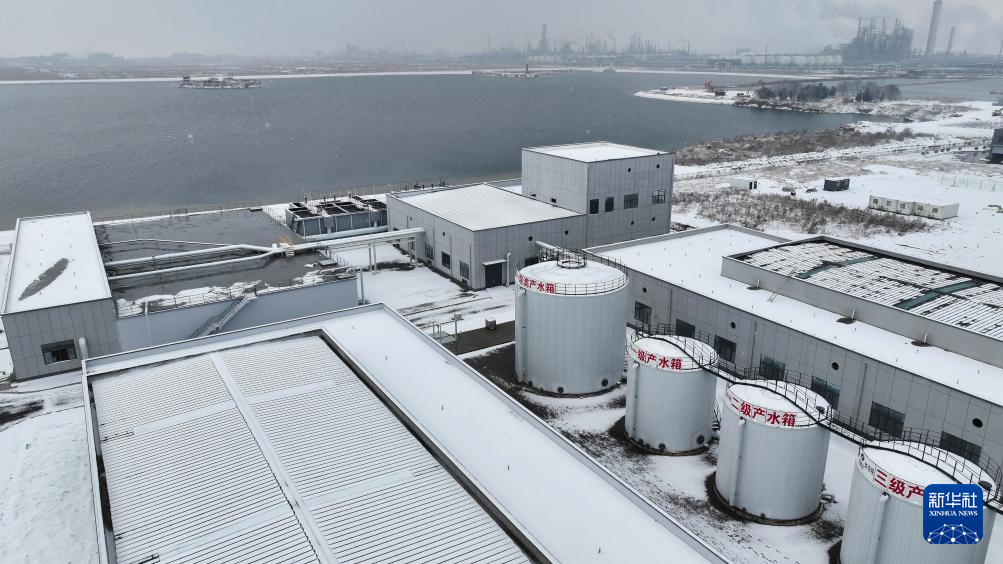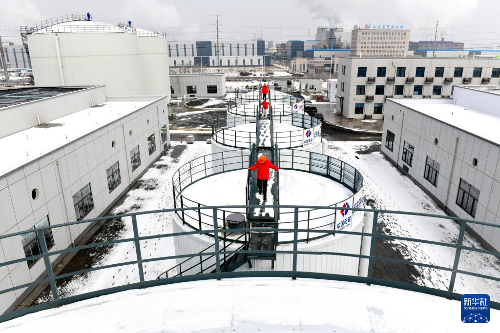 3月6日,在山东省东营港中水回用项目,中国电建华东院的工作人员雪后巡查产水箱。