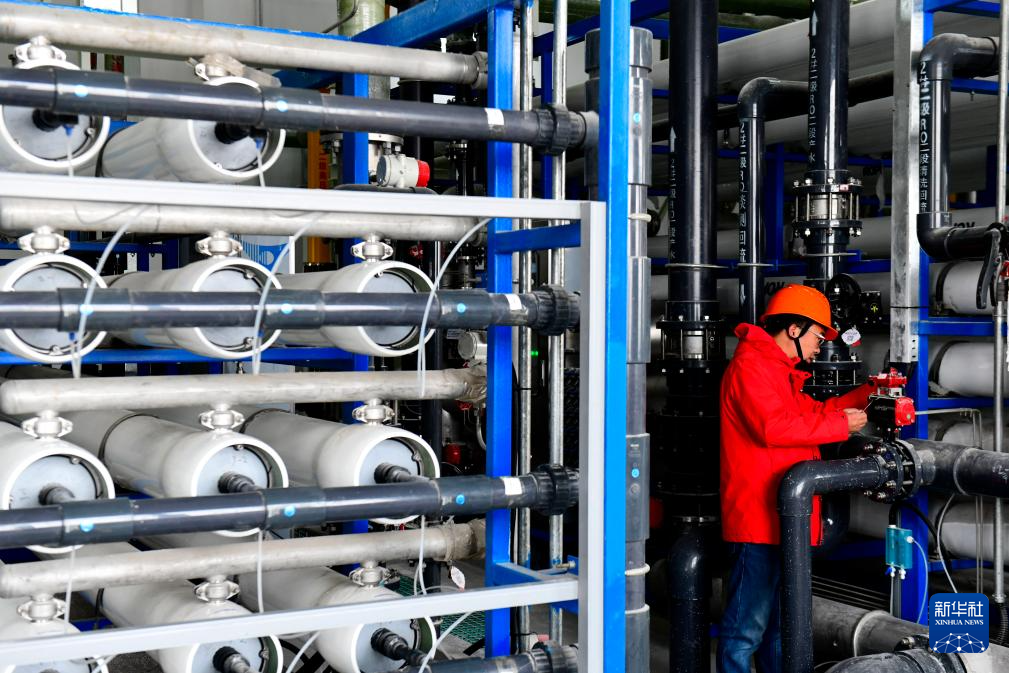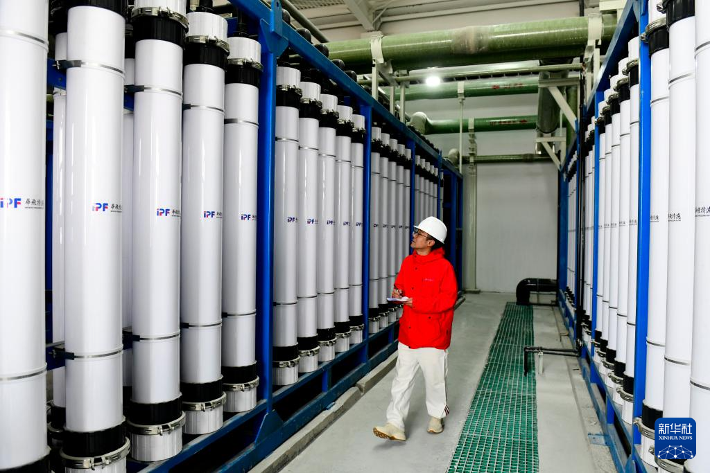 3月6日,在山东省东营港中水回用项目,中国电建华东院的工作人员巡查超滤装置。