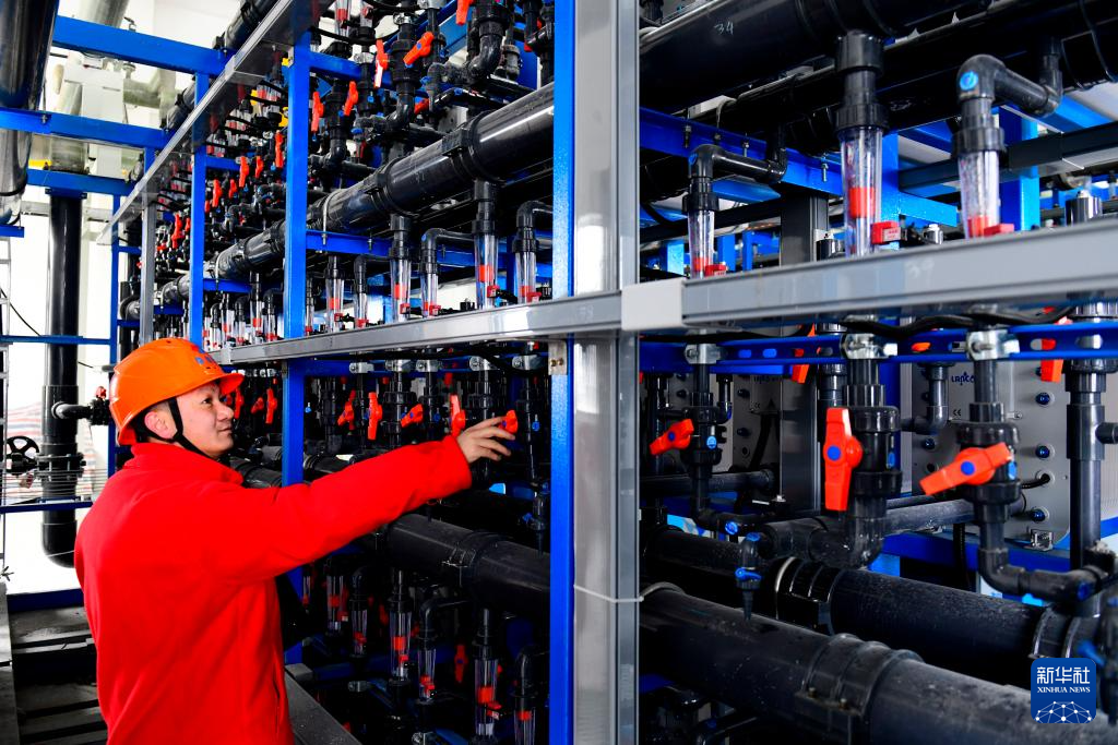 3月6日,在山东省东营港中水回用项目,中国电建华东院的工作人员巡查电除盐系统。