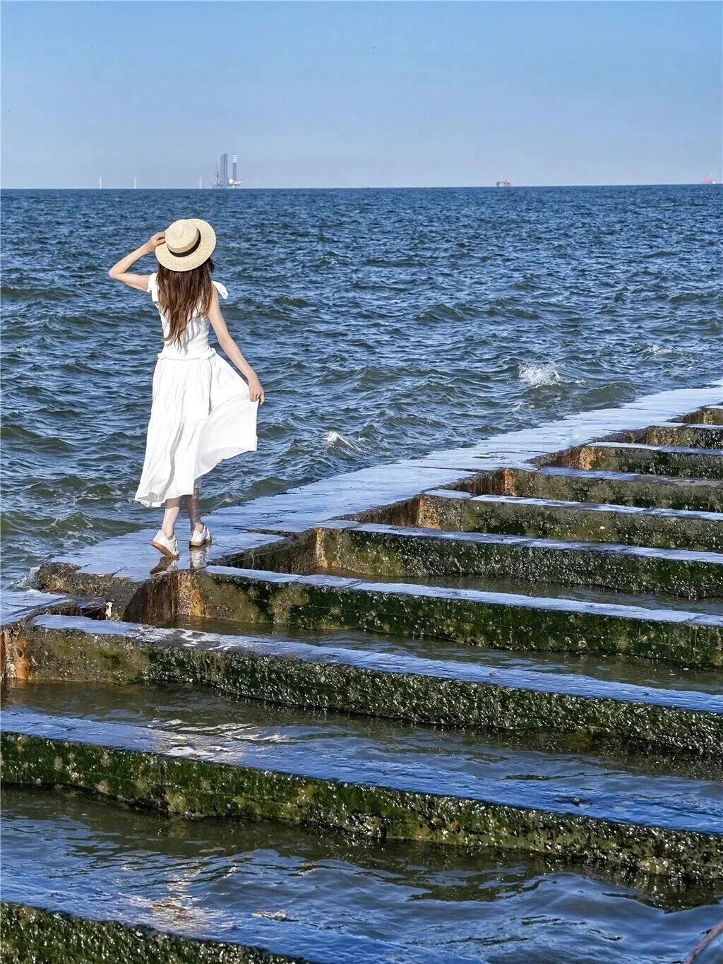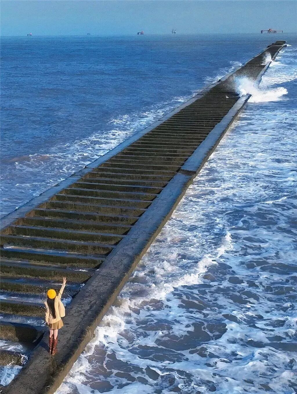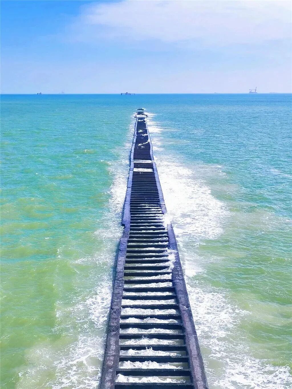 在孤东海堤,沿着堤坝前行,看海天相接 看浪花拍岸,沉浸在诗意与壮阔的海景中。