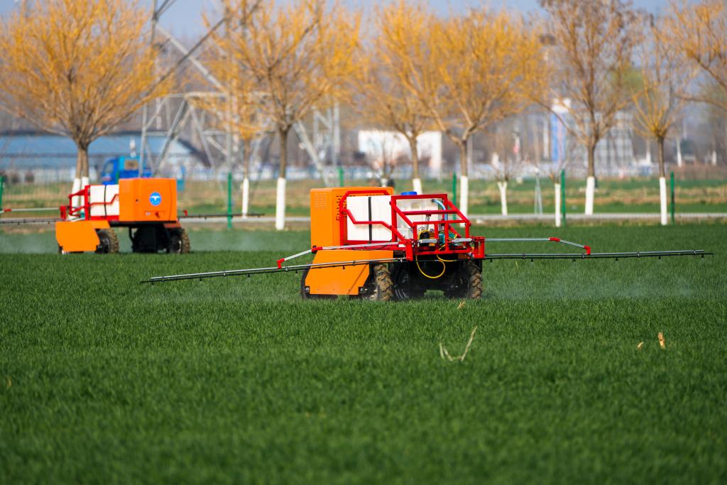 3月9日,在山东省肥城市安驾庄镇洼里无人智慧农场内,喷药机器人在田间喷洒农药。新华社记者 朱峥 摄