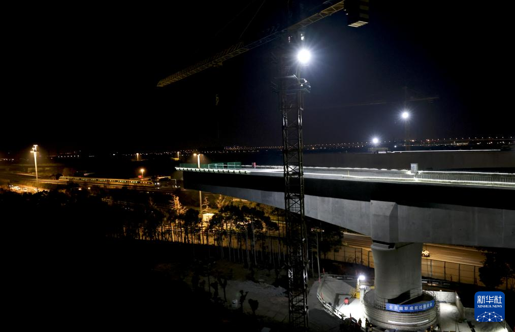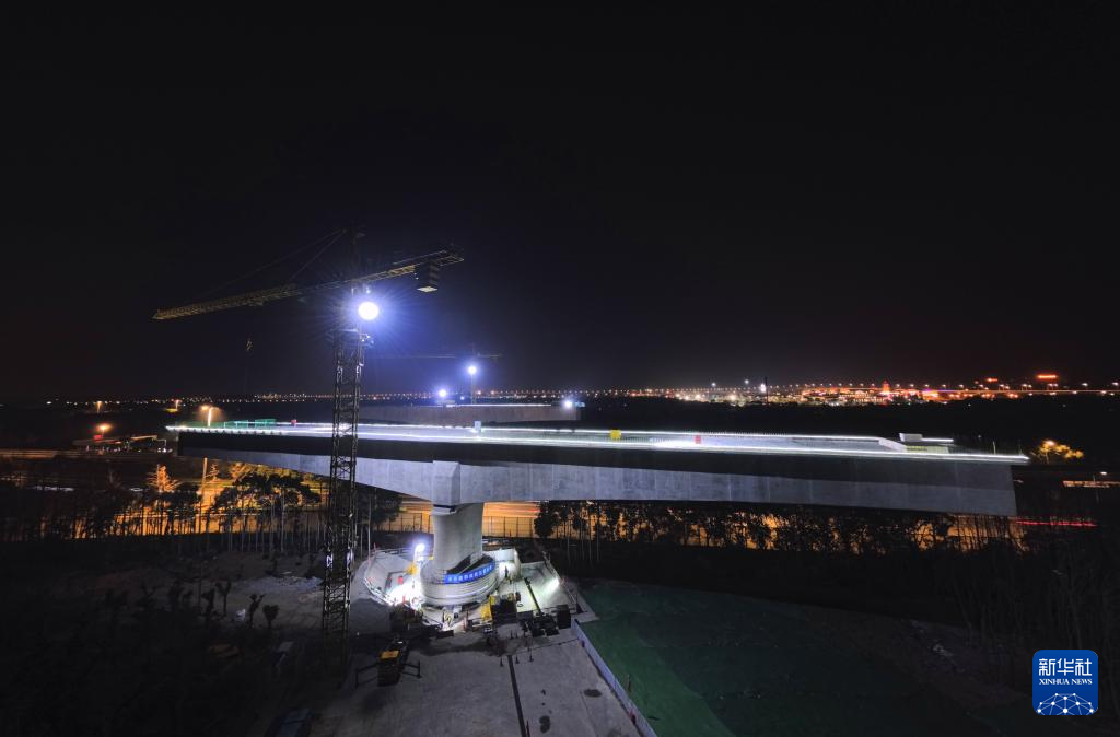 1月8日晚,沪苏通铁路二期(太仓至四团段)控制性工程——川沙特大桥跨磁悬浮连续梁,在4台智能连续转体千斤顶同步牵引下,上跨既有磁悬浮线路及迎宾高速公路,成功实现转体,转体角度60度,转体总重量约1万吨。该工程是国内首例在高速磁悬浮运营线路上方实施的大跨度连续梁转体施工,标志着沪苏通铁路二期建设取得关键进展。