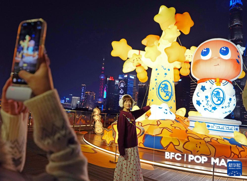 2月1日晚,游客在BFC外滩金融中心露台上的灯组前留影。