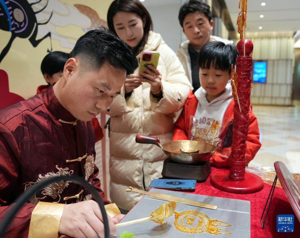 2月1日晚,在BFC外滩金融中心商场,手工艺人制作玩偶糖画。