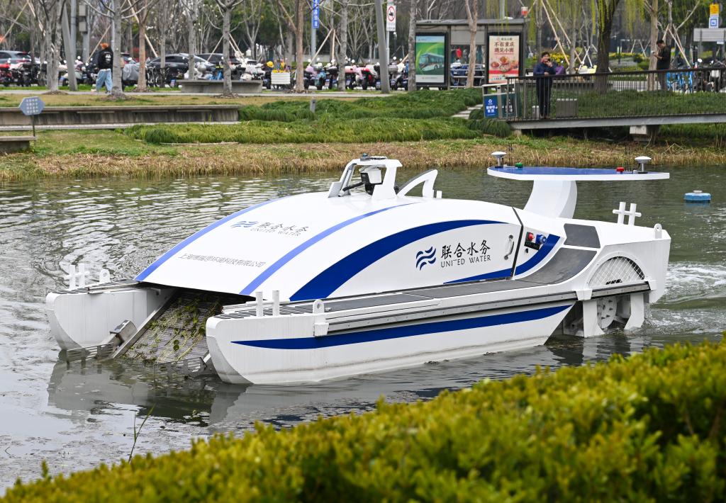 3月19日,无人保洁船在上海市河湖现代化管养试点“龙华机场河”上作业。新华社记者 陈浩明 摄