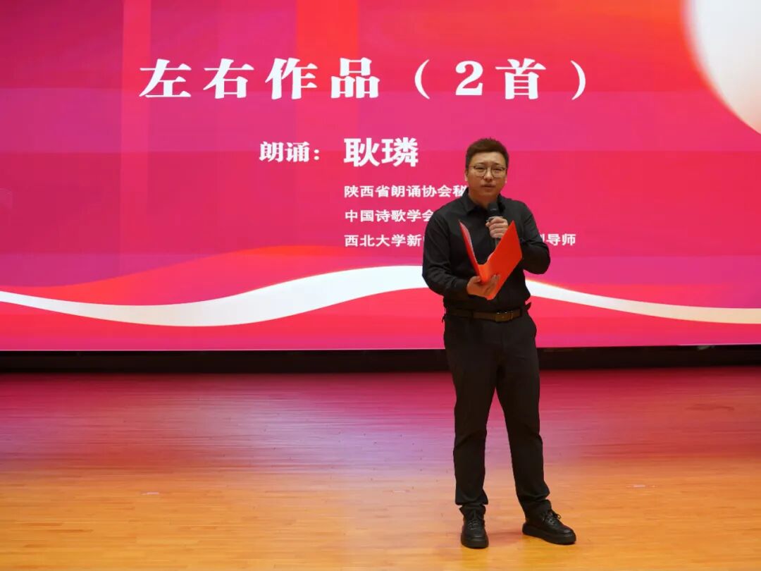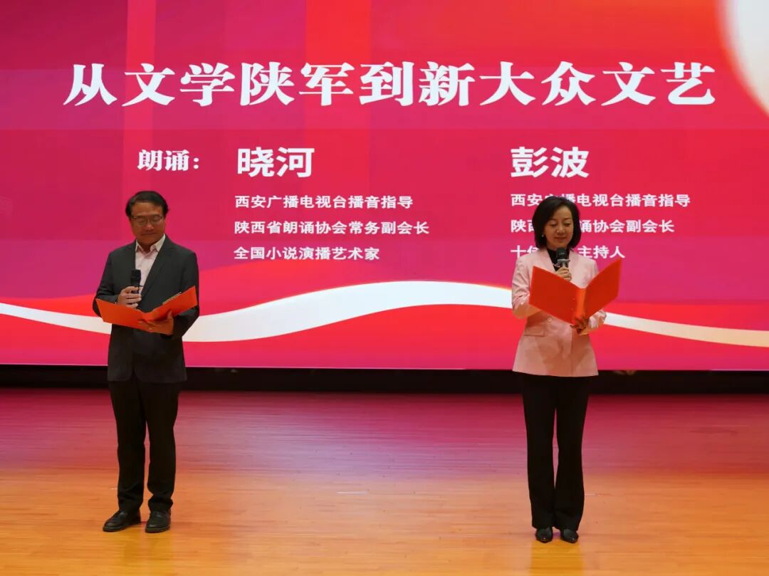 朗诵环节,陕西省朗诵协会的艺术家们用声音赋予文字以温度。朗诵协会副会长彭波深情演绎了外卖员诗人王计兵的作品,“赶时间的人没有四季,只有一站和下一站”,让人感受到奔走于街巷间的坚韧与诗意;朗诵协会秘书长耿璘朗诵的左右诗作《裂缝》,引发了关于个体与世界的深邃叩问。随后,彭波与朗诵协会常务副会长晓河联袂朗诵会议主题原创作品《从文学陕军到新大众文艺》,艺术化地勾勒了三秦文脉薪火相传、生生不息的动人画卷。