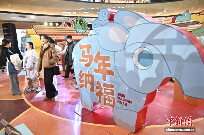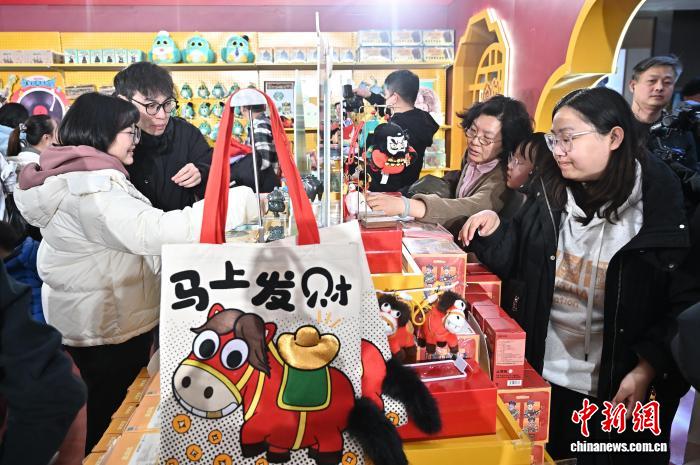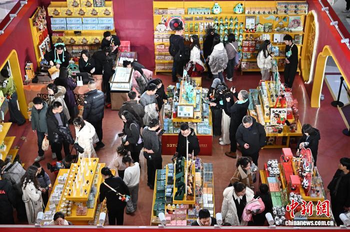 2月8日,山西博物院新春特展在太原万象城启幕,特展现场发售“行走的晋侯鸟尊”“马上发财”等文创新品,融合文物与潮流设计,受到观众喜爱。中新社记者韦亮 摄