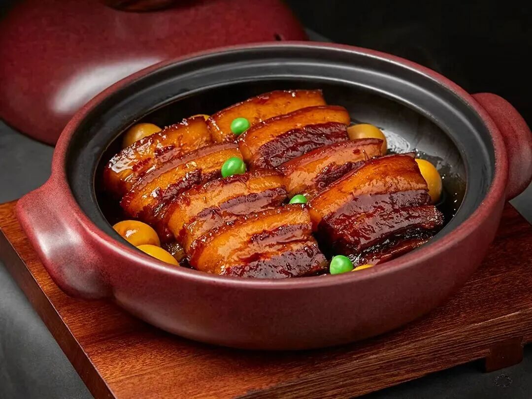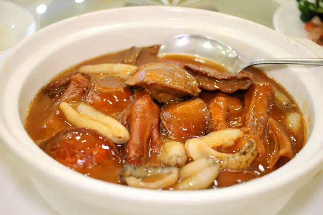 鲍汁扣三宝则是经典的粤式硬菜,鲍鱼、鹅掌与花菇在浓稠的鲍汁中慢炖入味,每一口都充满了胶原蛋白的醇香。