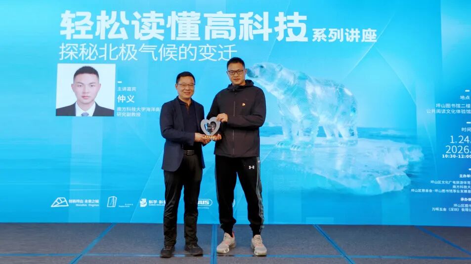 1月24日上午,坪山图书馆二楼活动现场暖意融融,2025“轻松读懂高科技”系列讲座第八场如期举行。南方科技大学研究副教授仲义带着他亲历北极的科考故事与珍贵数据,以《探秘北极气候变迁》为题,以专业视角解锁北极的万千奥秘,带领现场读者跨越山海,开启一场兼具科学性与趣味性的极地探索之旅。