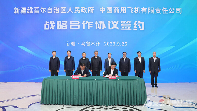 9月26日,新疆维吾尔自治区人民政府与中国商用飞机有限责任公司在乌鲁木齐签署战略合作协议。石榴云/新疆日报记者 崔志坚摄