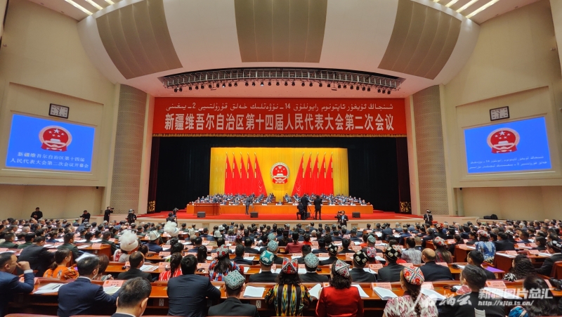 1月30日,自治区第十四届人民代表大会第二次会议在新疆人民会堂开幕。来自各行各业、各条战线的自治区人大代表肩负人民重托出席大会,认真履行宪法和法律赋予的神圣职责。图为会议现场。石榴云/新疆日报记者谢龙摄