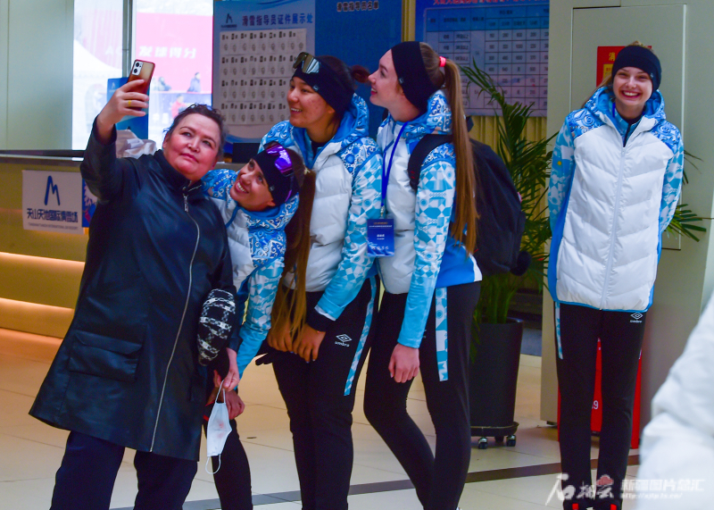 3月21日,游客在天山天池国际滑雪场与来自哈萨克斯坦的运动员合影留念。