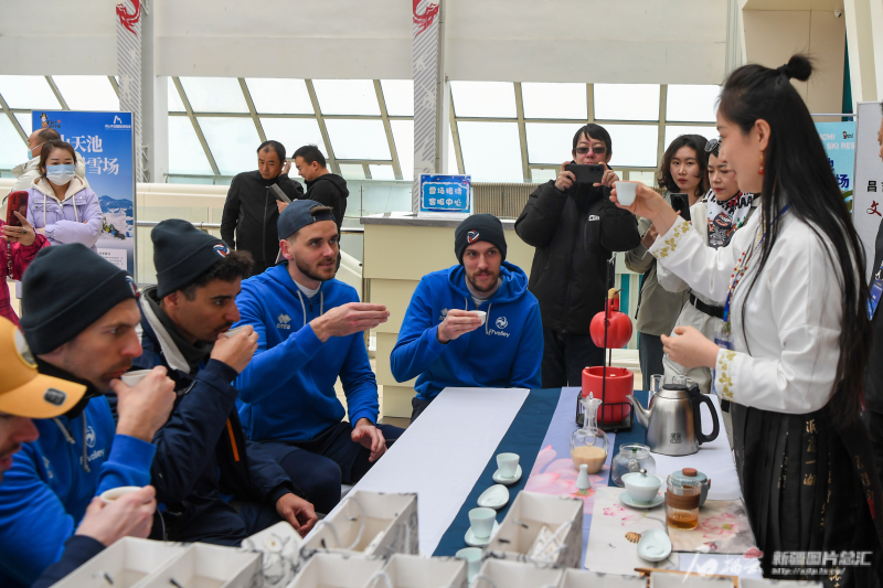 3月21日,法国队运动员在天山天池国际滑雪场品茶。