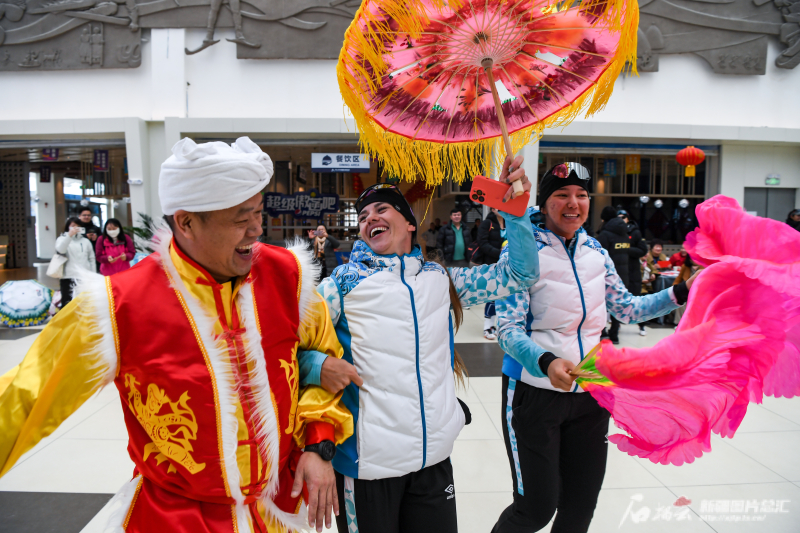 3月21日,来自哈萨克斯坦的运动员与当地群众在天山天池国际滑雪场体验民俗表演。