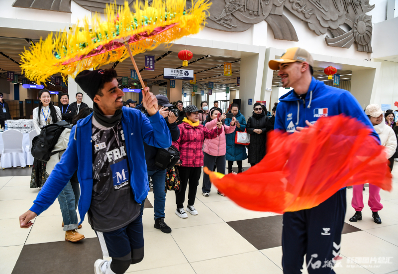 3月21日,来自法国的运动员在天山天池国际滑雪场体验民俗表演。