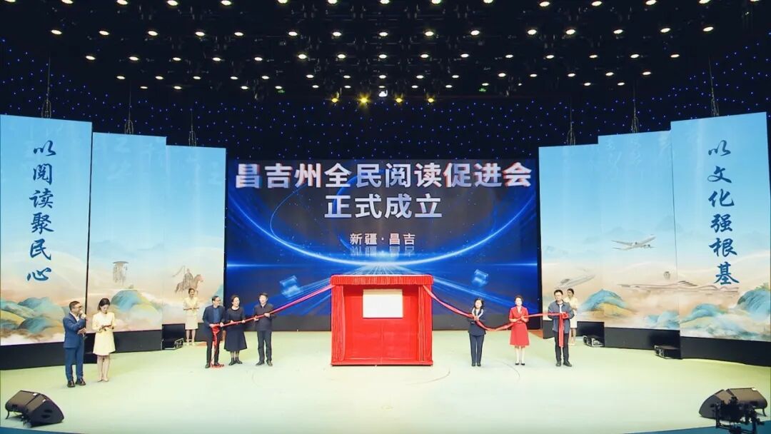 与会嘉宾共同为全疆首个地州级全民阅读促进会——昌吉州全民阅读促进会揭牌。记者左晓雨 摄