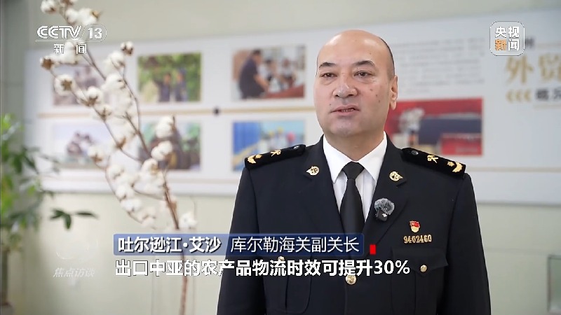 库尔勒海关副关长吐尔逊江·艾沙:出口中亚的农产品物流时效可提升30%,大大带动巴州特色农产品、鲜食产品开拓中亚和欧洲市场。为了助力新疆发展,库尔勒海关对鲜活产品实行“随报随查、随查随放”,整体查验时间压缩60%。
