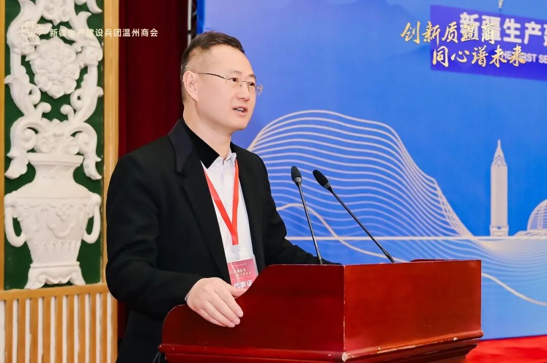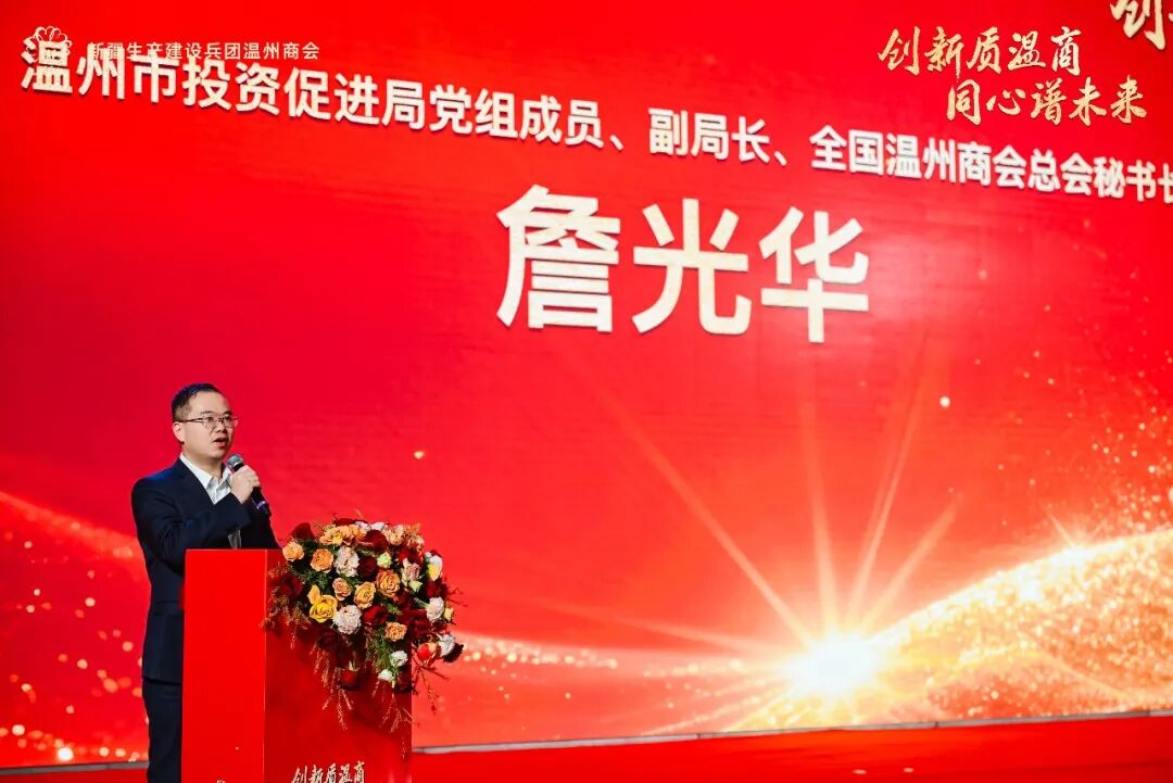 温州市投资促进局党组成员、副局长,全国温州商会总会秘书长詹光华出席会议并讲话。他代表温州市全国温州商会总会、温州市投资促进局对大会胜利召开及新一届理事会产生表示热烈祝贺,向关心支持温商发展的新疆各级领导和社会各界致以谢意。詹光华介绍了温州2025年GDP突破万亿元、常住人口即将破千万的良好发展态势,以及“5+5”万亿产值产业集群、新能源与未来产业布局等发展成果,详解了全国温州商会总会为在外温商推出的机票优惠、产融平台对接等“新八条”服务措施。他寄语在新温商传承“四千精神”,迈向“新质温商”,推动企业做大做优;希望商会以党建促会建,提升服务水平与凝聚力;鼓励温商加强与家乡互动,争做双城发展“领头雁”,家乡将以更优营商环境迎接乡亲返乡投资。