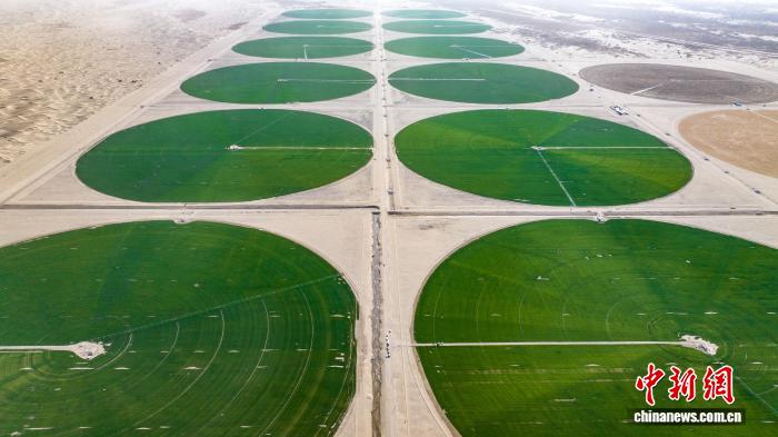 中新网乌鲁木齐4月11日电 (张家伟赵凯)近日,塔克拉玛干沙漠南缘的漫漫黄沙中,一抹浓淡相间的绿色“同心圆”,与周边苍茫寂寥的沙漠形成震撼对比。这是新疆生产建设兵团第十四师昆玉市建设者用一年时间,在7.38万亩沙漠治理区绘就的生态画卷,实现一场“沙漠变良田”的蜕变。