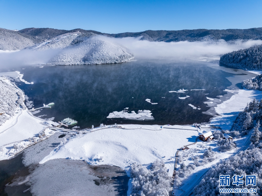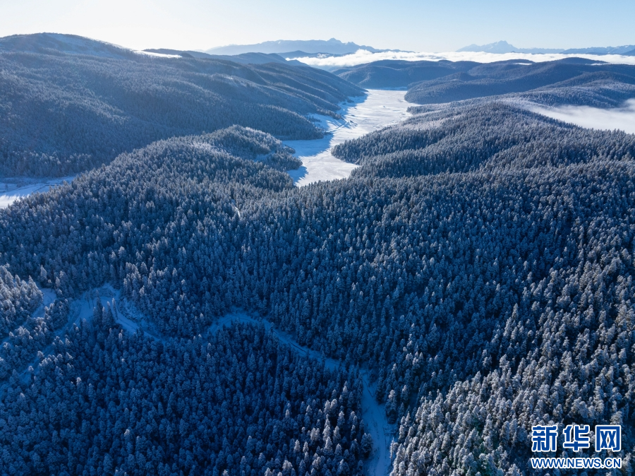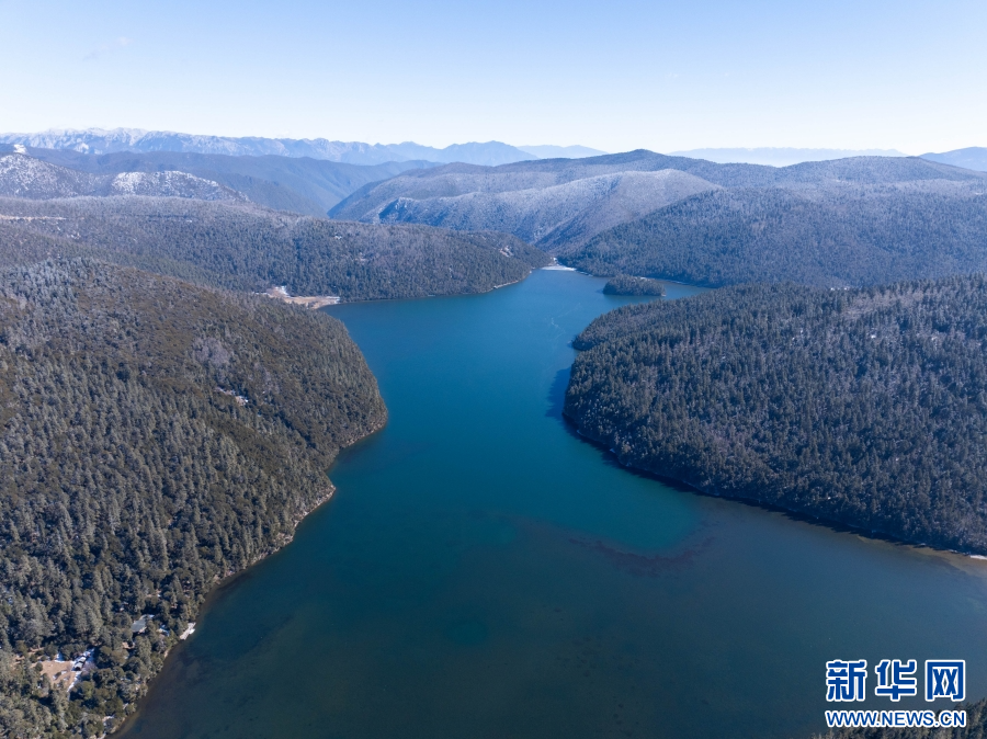 雪后属都湖区域,湖泊雪峰交相呼应(12月18日摄)。新华网发(刘云 摄)